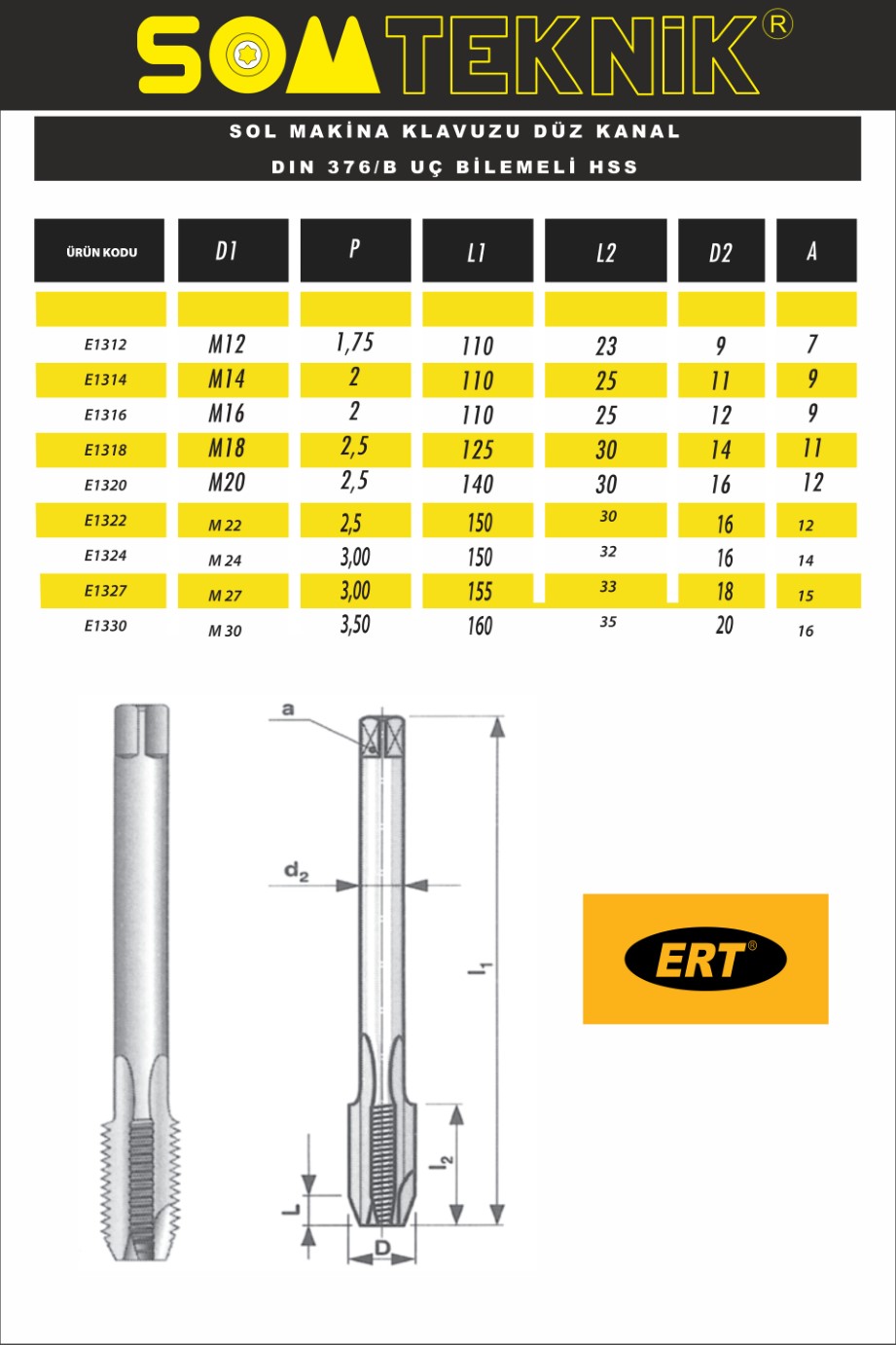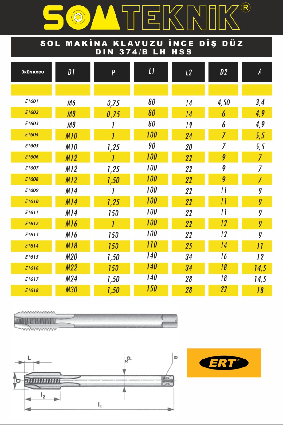 ERT SOL MAKİNE KILAVUZU İNCE DİŞ DIN 374 / B LH HSSE DÜZ